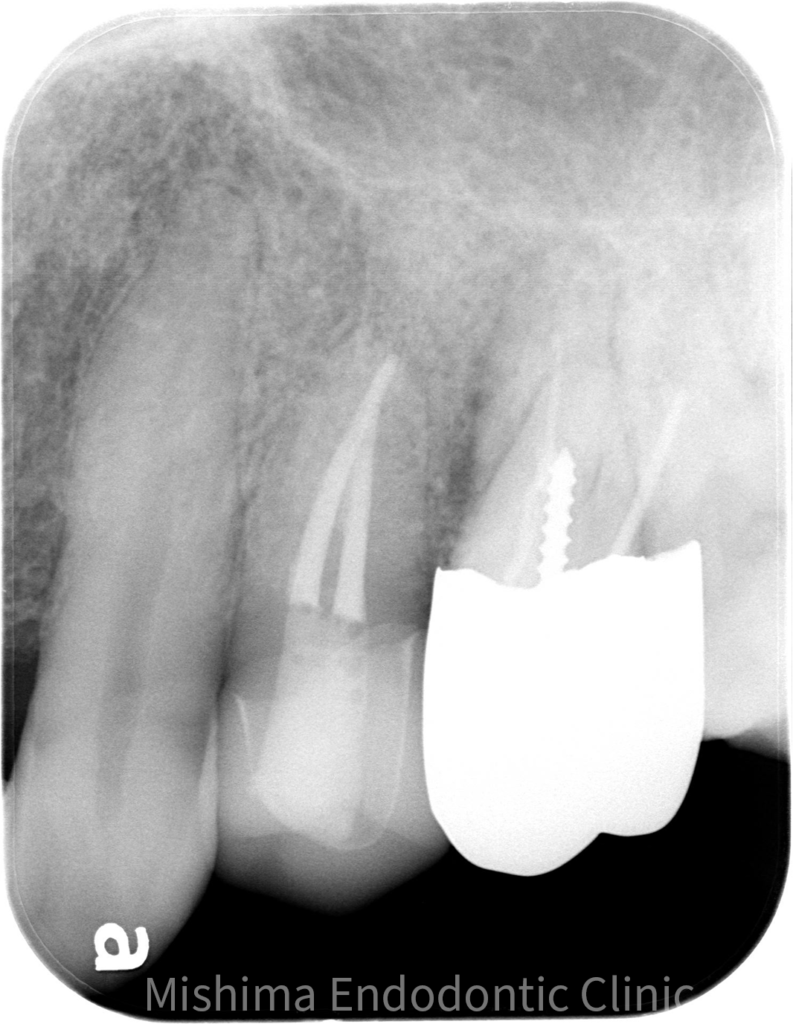 | 治療内容 | 左上4が歯頚部よりカリエスを認めた。歯肉縁下カリエス、かつ、左上5の口蓋側への捻転により衛生管理が困難なため、左上4を抜歯し、左上5を保存することとした。 矯正は希望されなかったため、5→4に自家歯牙移植を行なった。 |