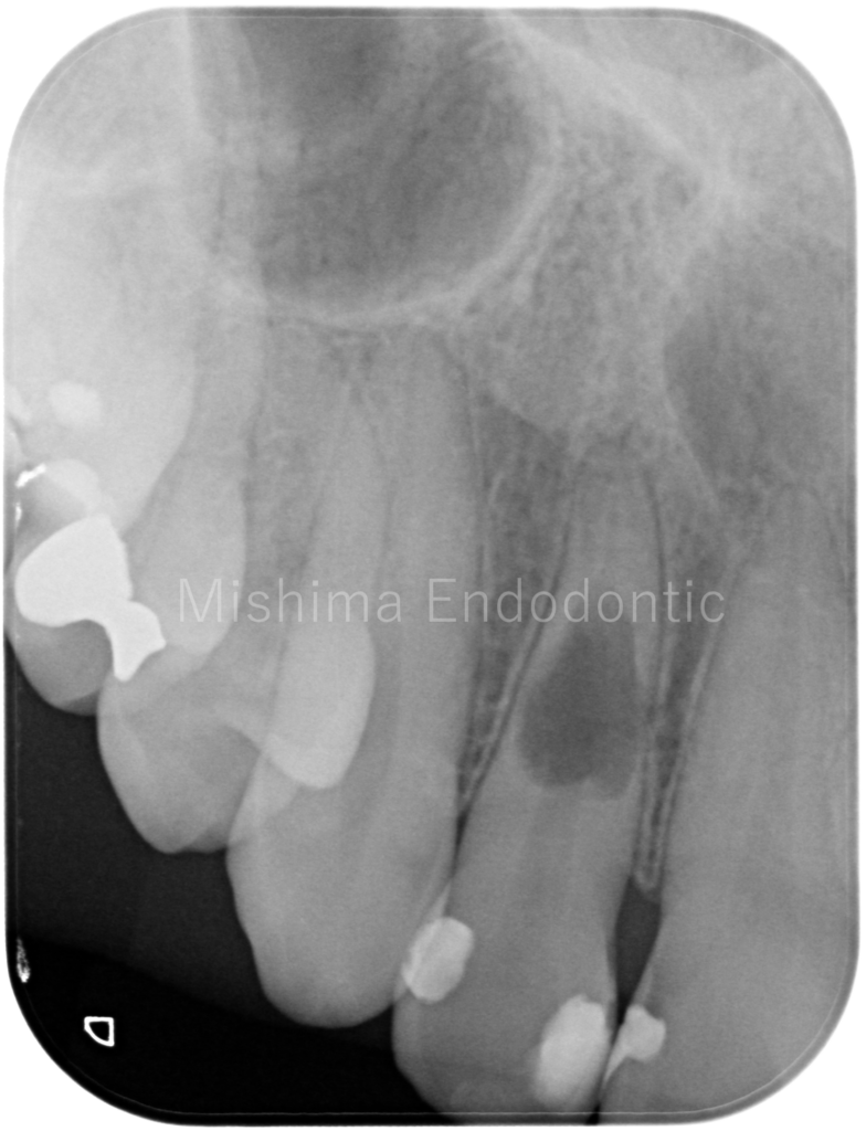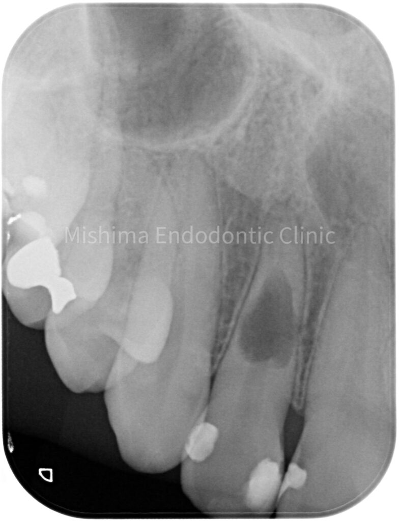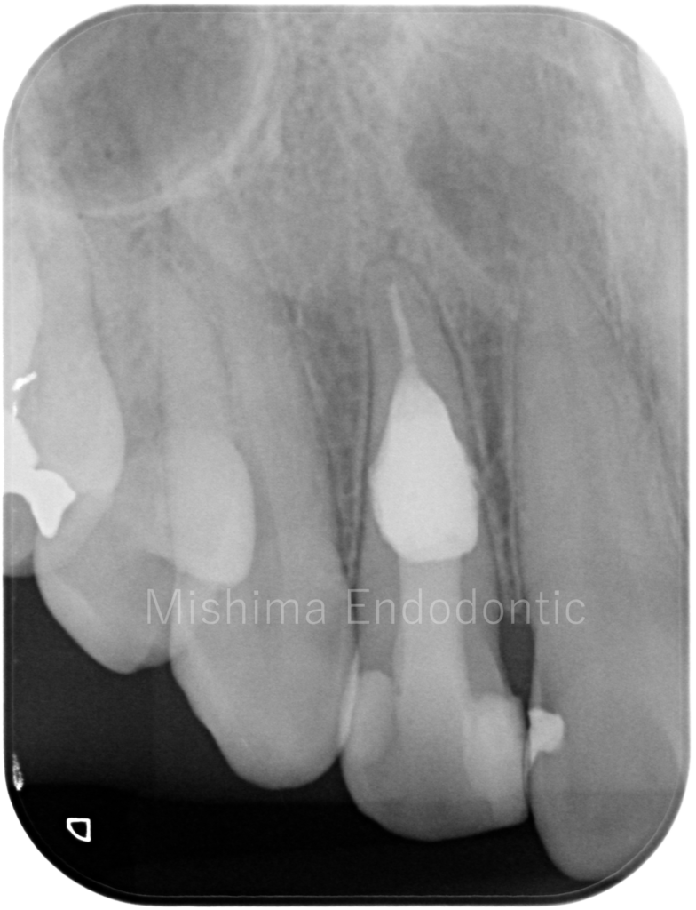 | 治療内容 | 歯髄診査により生活反応は認めない。X線にて内部炎症性吸収と診断。根管内を精査したところ、吸収部より根尖の歯髄は生活していた。根管治療を行い、バイオセラミックのパテにて充填。術後、症状、以上所見は認めず経過は良好。 |