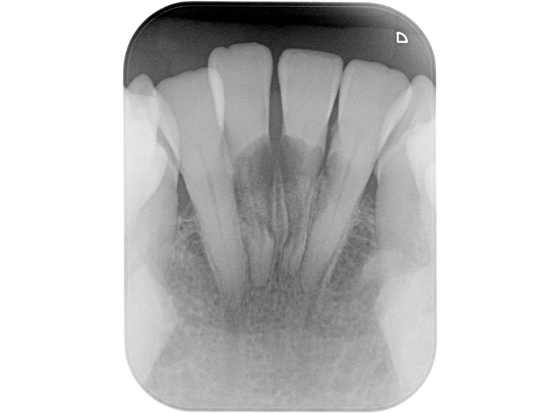 | 治療内容 | 6年前にサバイバルゲームでBB弾が歯に当たり、歯が欠けた。 歯髄診査では、11,21ともにEPT+、Cold+。11は侵襲性歯頚部吸収、21は内部の炎症性吸収と診断。また、11にはパーフォレーションも認めた。 21は根管治療、ダイレクトボンディングにて対応。 11は、歯冠部の審美に対してはダイレクトボンディングにて対応。 まず侵襲性歯頚部吸収による吸収部を粘膜剥離しバイオデンティンにて外部より封鎖。後日、パーフォレーション部をバイオデンティンにて根管内部よりリペア。歯髄は正常と診断したが、予防的に根管治療を行うこととした。歯冠部からのアクセスが困難だったため、逆根管治療(歯根端切除術)にて対応。 |